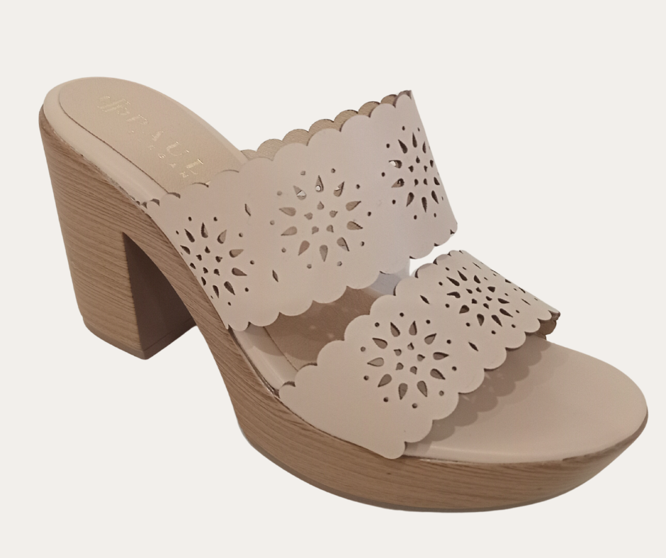 DH0 PV26 SANDALIA DE ENTRADA TIPO MULE DOSTIRAS ANCHAS CON TROQUELADO LASER TACON GRUESO 9CM ACABADO MADERA CON PLATAFORMA MARCA PAULIE ESTILO 3768PA