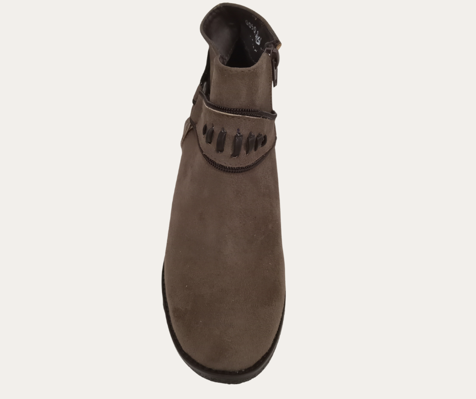 DB6S OI25 BOTIN CORTO T6CM CORTE GAMUZA SINTETICO TIRA DECORATIVA CON REMACHES CIERRE INTERNO MARCA BEVY FASHION ESTILO 50BEVY